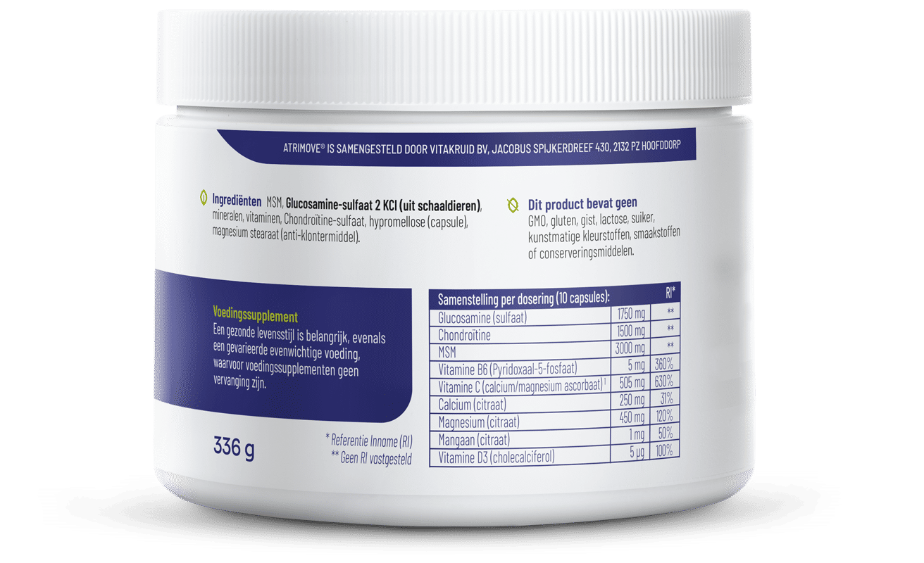 Atrimove® bevat 2000 mg glucosaminesulfaat. Dit staat gelijk aan 1750 elementaire glucosamine. Wereldwijd is er geen enkel glucosamine supplement met een dergelijk hoge dosering. Laat staan dat er een glucosamine product bestaat dat met zo veel andere gezondheidsbevorderende nutriënten wordt gecombineerd. Daarnaast garandeert Vitakruid de allerhoogste kwaliteitseisen met betrekking tot zuiverheid en microbiologische kwaliteit volgens United States Pharmacopoeia richtlijnen.