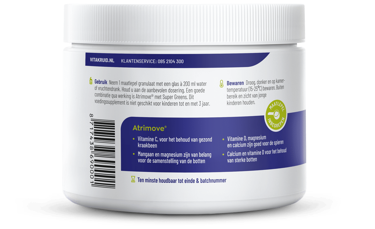 Atrimove®bevat de hoge dosering van 7,6 mg mangaan per maatschep. Bovendien bevat Atrimove® vitamine C in de vorm calcium/magnesium ascorbaat. Een uiterst goed opneembare vorm die voor een synergetische werking zorgt met calcium en magnesium. Twee nutriënten die een waardevolle aanvulling voor de Atrimove® formule vormen!
