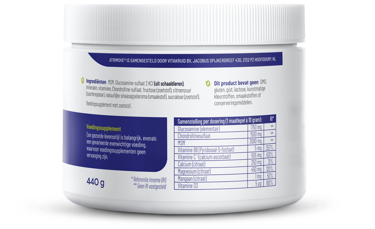 Atrimove® bevat 2000 mg glucosaminesulfaat. Dit staat gelijk aan 1750 elementaire glucosamine. Wereldwijd is er geen enkel glucosamine supplement met een dergelijk hoge dosering. Laat staan dat er een glucosamine product bestaat dat met zo veel andere gezondheidsbevorderende nutriënten wordt gecombineerd. Daarnaast garandeert Vitakruid de allerhoogste kwaliteitseisen met betrekking tot zuiverheid en microbiologische kwaliteit volgens United States Pharmacopoeia richtlijnen.