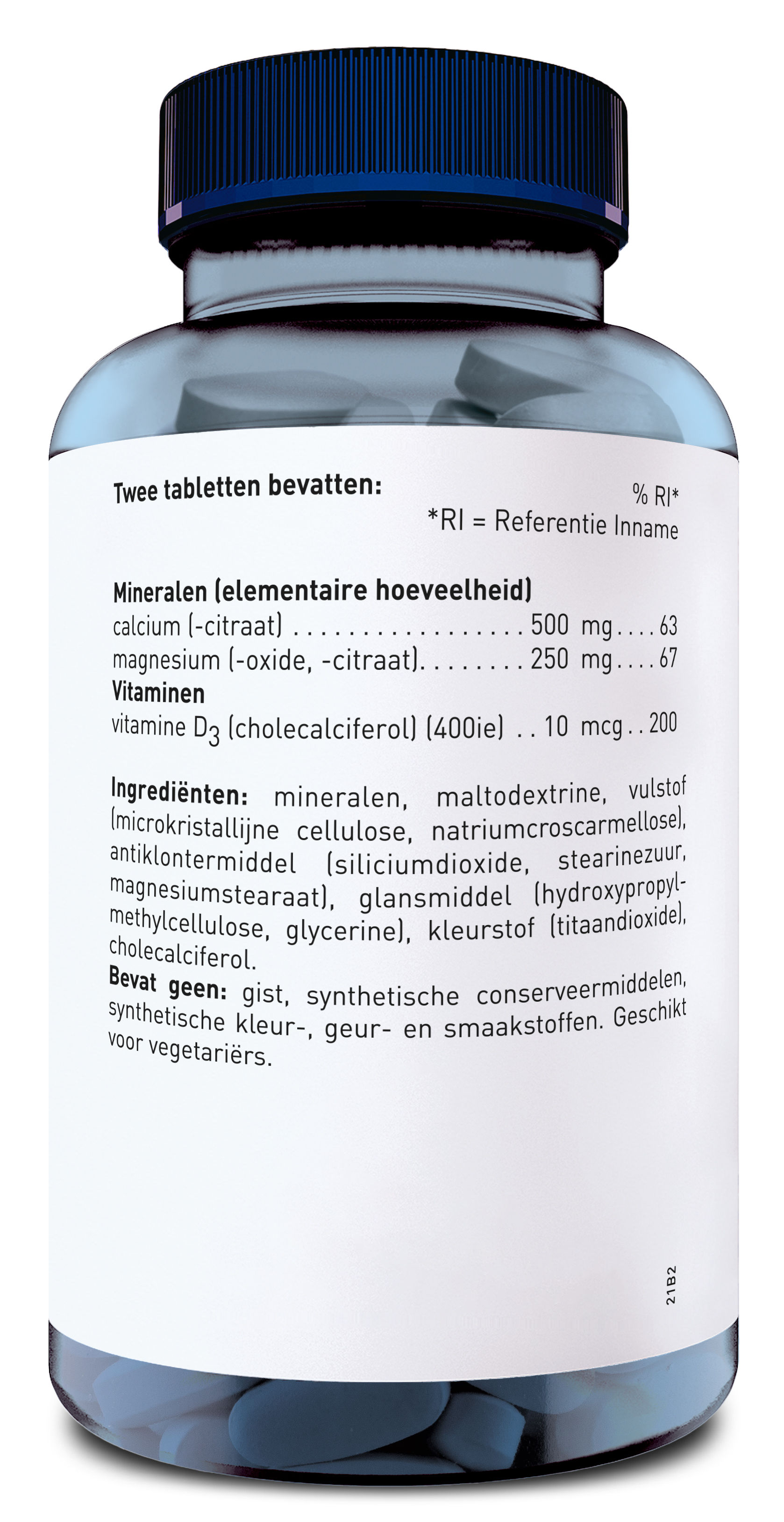 | Calcium (-citraat) Magnesium (-oxide, -citraat) Vitamine D3 (cholecalciferol) (400ie) |