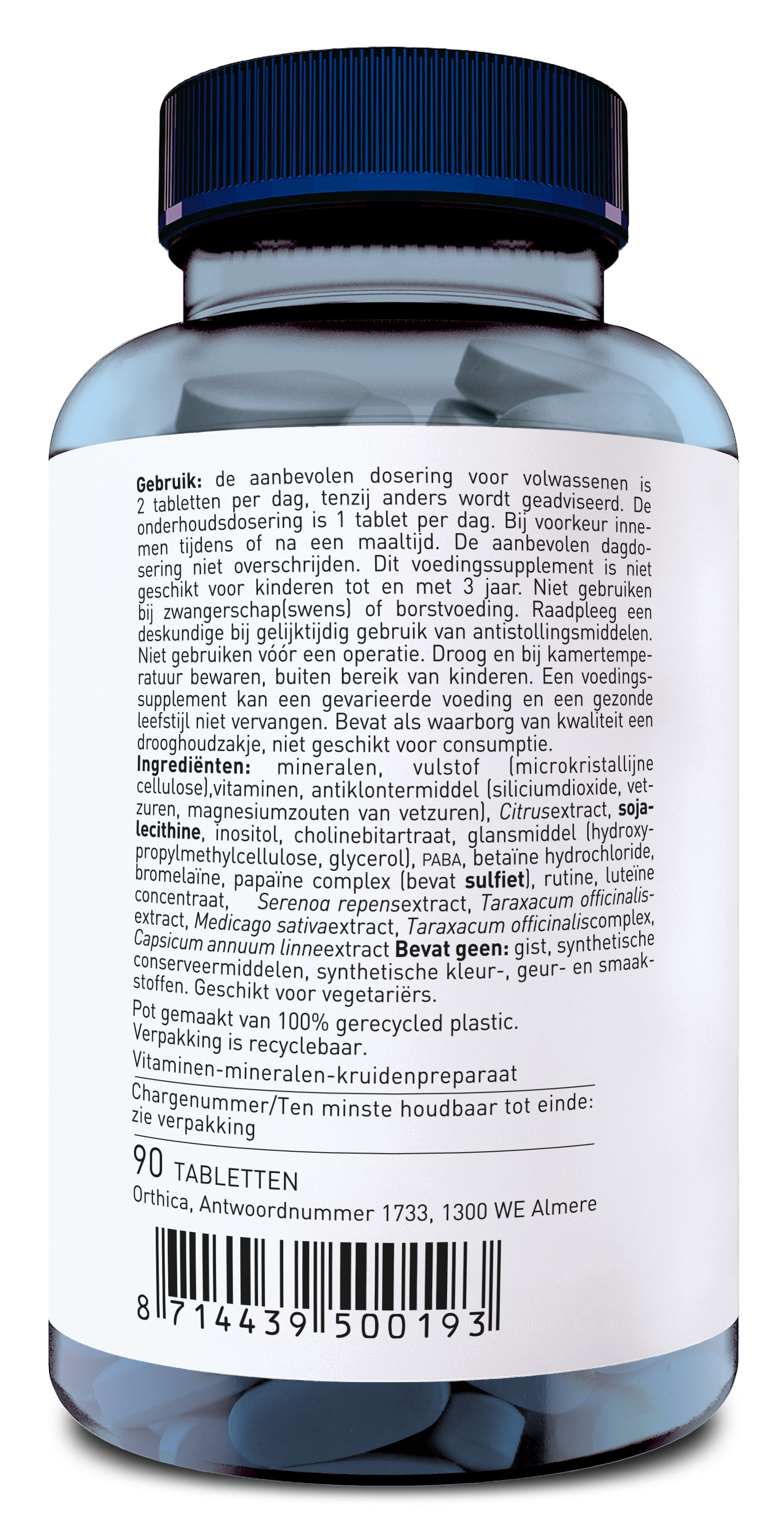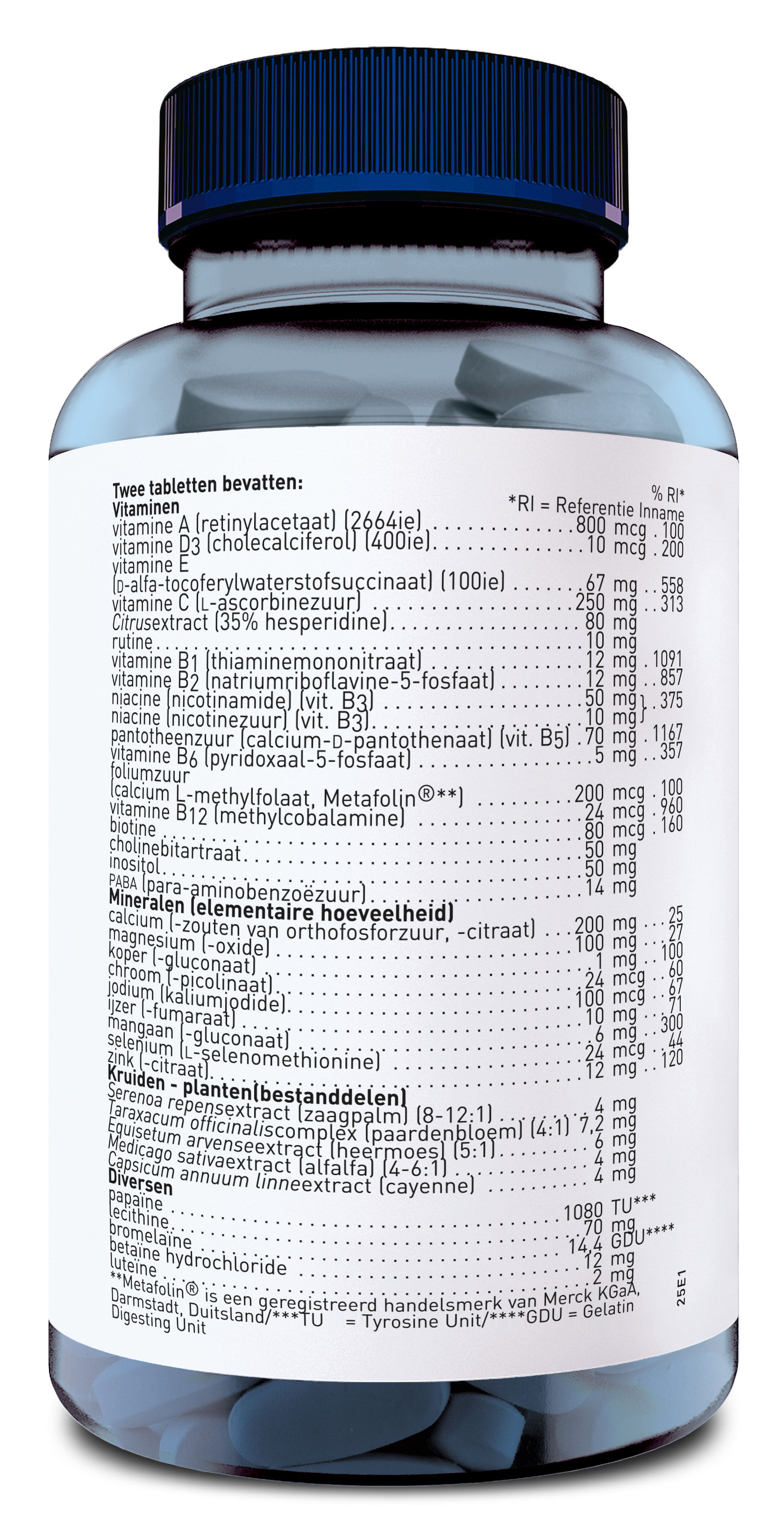 Mineralen, vulstof (microkristallijne cellulose), vitaminen, antiklontermiddel (siliciumdioxide, stearinezuur, magnesiumstearaat), Citrusextract, SOJAlecithine, inositol, cholinebitartraat, glansmiddel (hydroxypropylmethylcellulose, glycerine), PABA, betaïne HCl, papaïne (bevat SULFIET), ossegal, bromelaïne, rutine, verstevigingsmiddel (acaciagom), Solidago virgaureaextract, Rumex crispusextract, Serenoa repensextract, Taraxacum officinalisextract, Equisetum arvenseextract, Medicago sativaextract, Capsicum annuum fructusextract.
