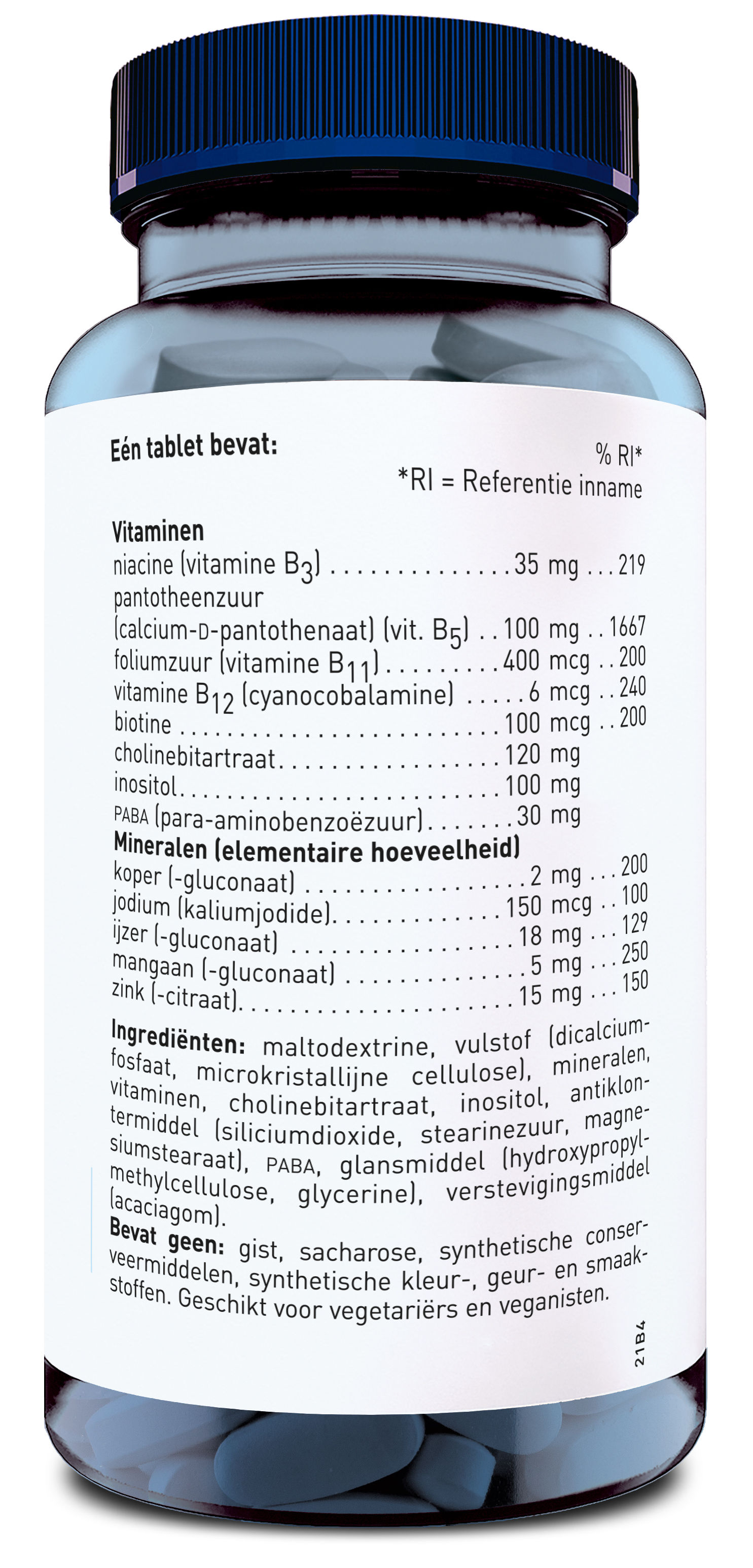 Maltodextrine, vulstof (dicalciumfosfaat, microkristallijne cellulose), mineralen, vitaminen, cholinebitartraat, inositol, antiklontermiddel (siliciumdioxide, magnesiumzouten van vetzuren, magnesiumstearaat), PABA, glansmiddel (hydroxypropylmethylcellulose, glycerine), verstevigingsmiddel (acaciagom).