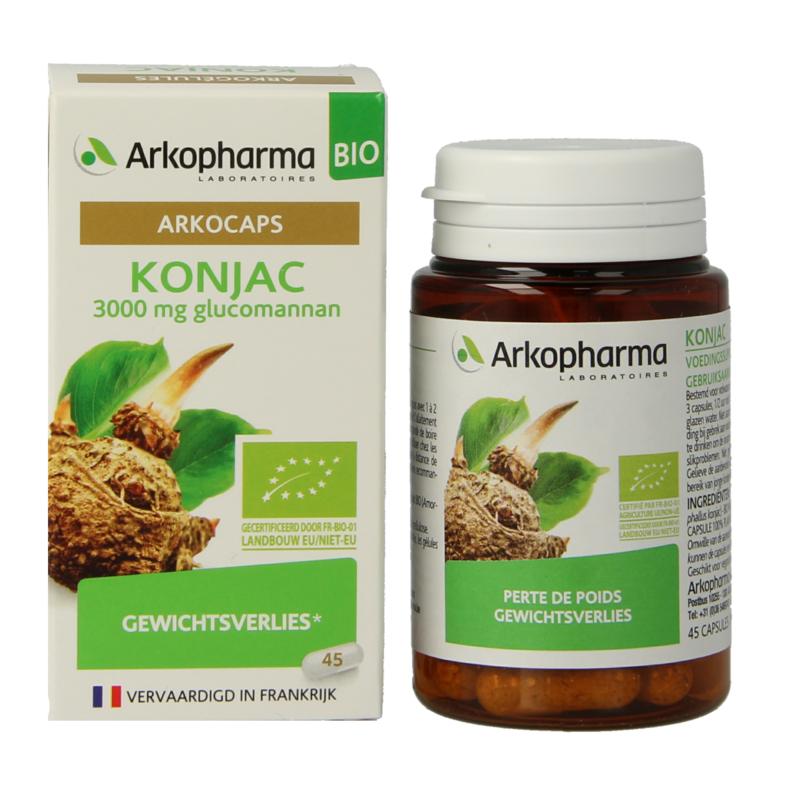 Poeder van bio Konjac (Amorphophallus konjac), bio maïszetmeel, capsule 100% plantaardig: hydroxypropylmethylcellulose.