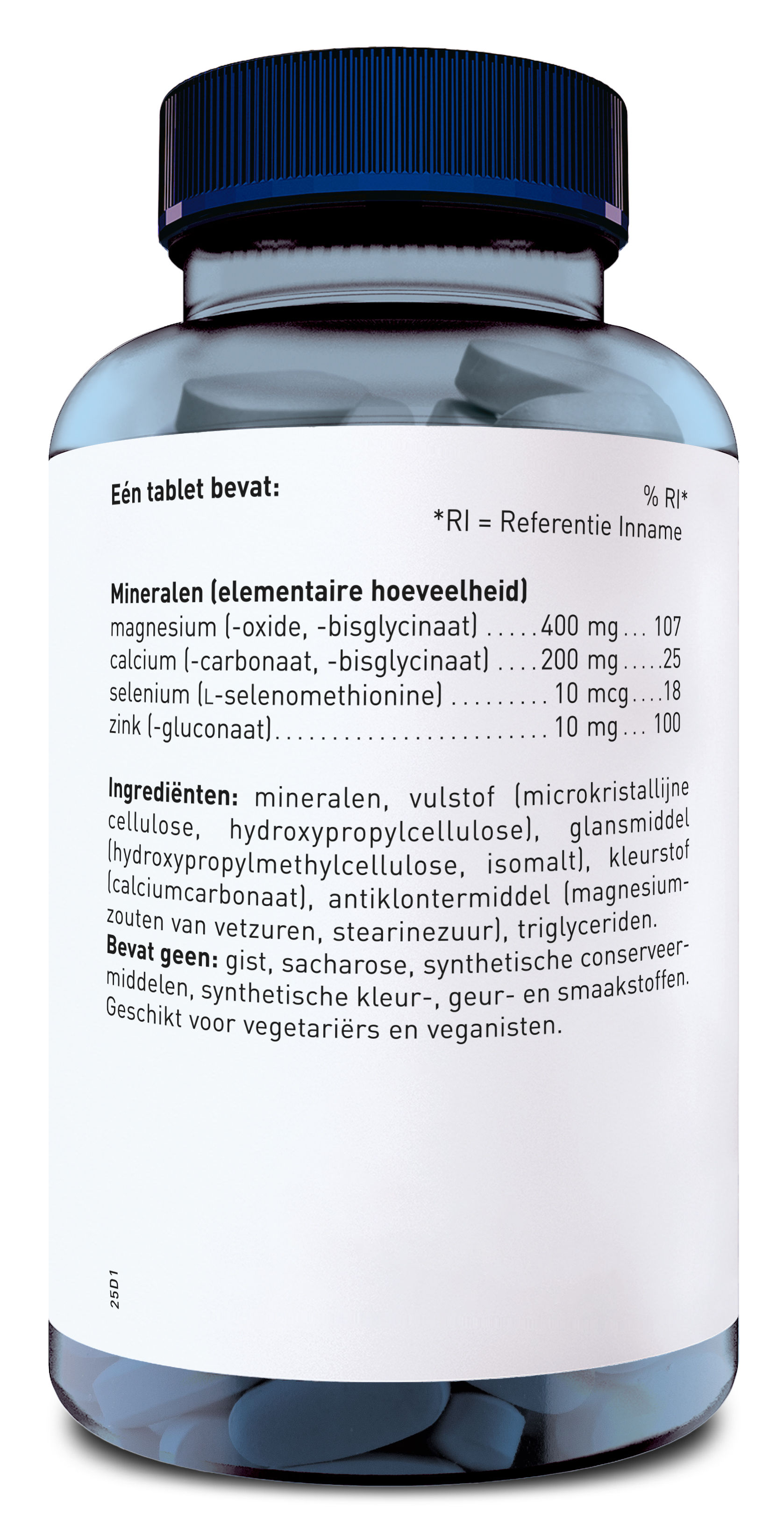 | magnesium (-oxide, -bisglycinaat) | 400 mg | 107 |