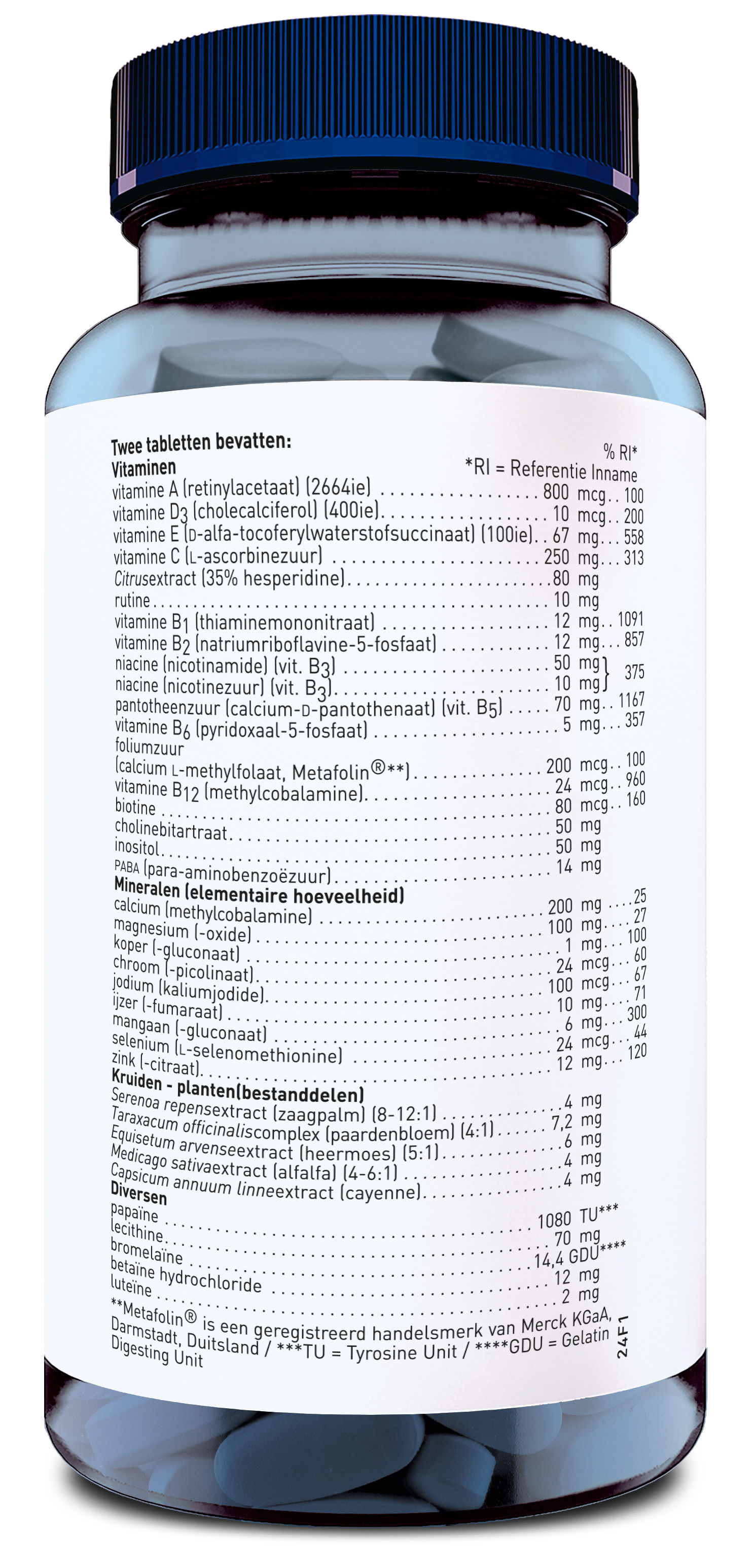 | Samenstelling per dagdosering van 2 tabletten: | % RI* | ||