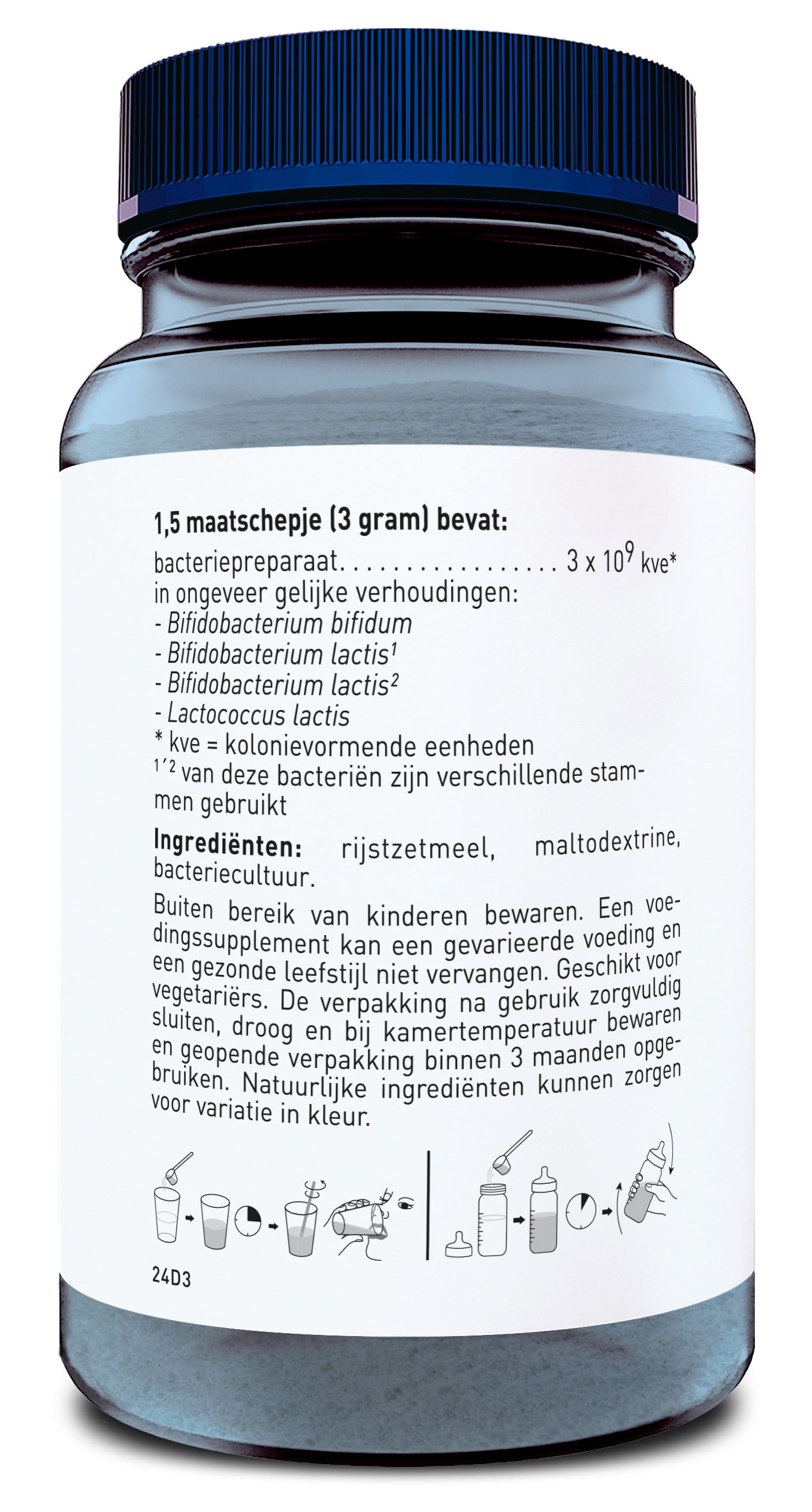 Probiotica in poedervorm voor moeder en baby (zuigelingen). Te gebruiken vanaf de laatste zes weken van de zwangerschap. Bevat 4 bacteriestammen.