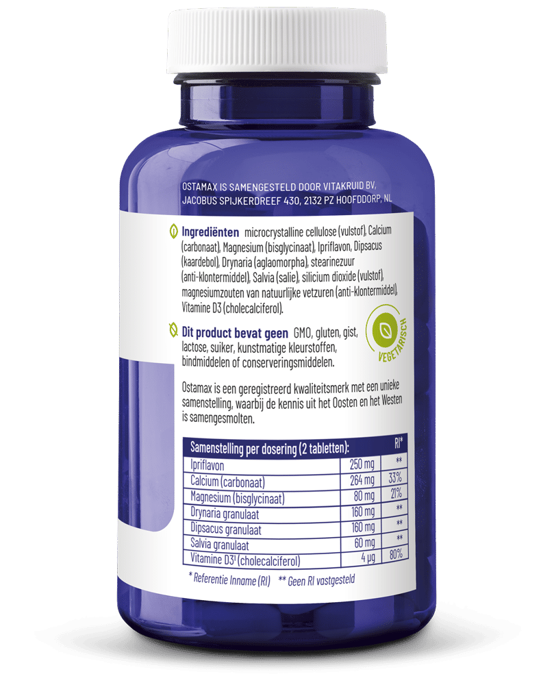 Vitakruid fuseert de rijke kennis uit de Traditionele Chinese Geneeskunde (TCG) met de moderne kennis uit het Westen. Dit kruiden, vitaminen en mineralen supplement bevat onder andere magnesium (bisclycinaat), vitamine D, calcium. Verder is deze formule verrijkt met ipriflavonen en de Chinese kruiden salvia, kaardebol en drynaria. Vitakruid kan Ostamax daarom met trots het label uniek toekennen; het is de eerste formule met een dergelijke combinatie aan actieve nutriënten.