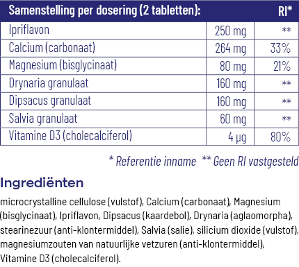 Kruiden, mineralen, ipriflavone, microkristallijne cellulose (vulstof), katoenzaadolie (antiklontermiddel), siliciumdioxide (antiklontermiddel), cyclodextrine (draagstof), vitamine D.