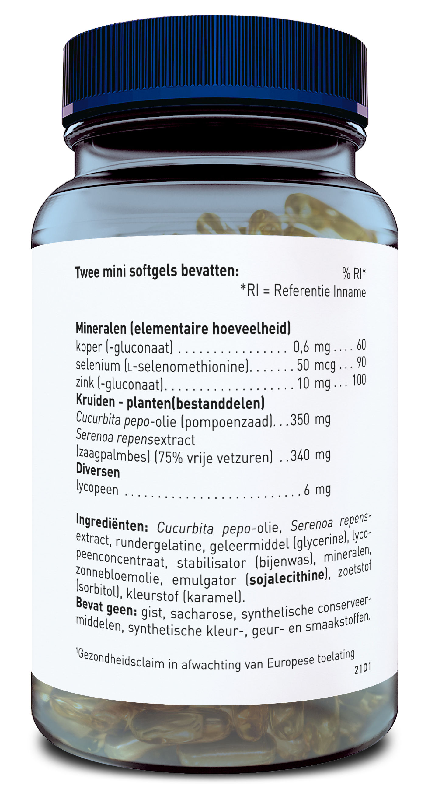 Cucurbita pepo-olie, Serenoa repensextract, rundergelatine, geleermiddel (glycerine), lycopeenconcentraat, stabilisator (bijenwas), mineralen, zonnebloemolie, emulgator (SOJA lecithine), zoetstof (sorbitol), kleurstof (karamel)
