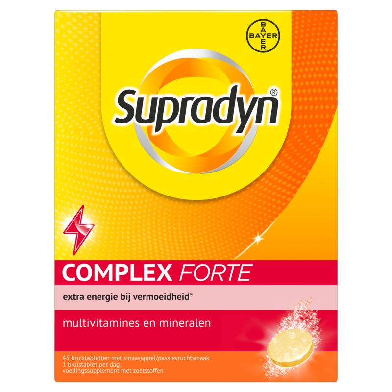 Sta actief in het leven! Supradyn Complex Forte geeft je als aanvulling op de voeding een steuntje in de rug tijdens veeleisende periodes waarin je de extra energie bij vermoeidheid goed kunt gebruiken**, zoals drukte op je werk, als je weerstand op de proef wordt gesteld, de combinatie werk/gezin. Neem als aanvulling op je dagelijkse voeding een hoog gedoseerde tablet van Supradyn Complex Forte. ; *De vitamines B2, B3, B5, B6, B12, C, het mineraal magnesium en het sporenelement ijzer activeren extra energie bij vermoeidheid. ; **Multiscope marktpeiler 2016 ; ***Vergeleken met Supradyn Complex Energy; ruim onder de maximaal veilige hoeveelheid.