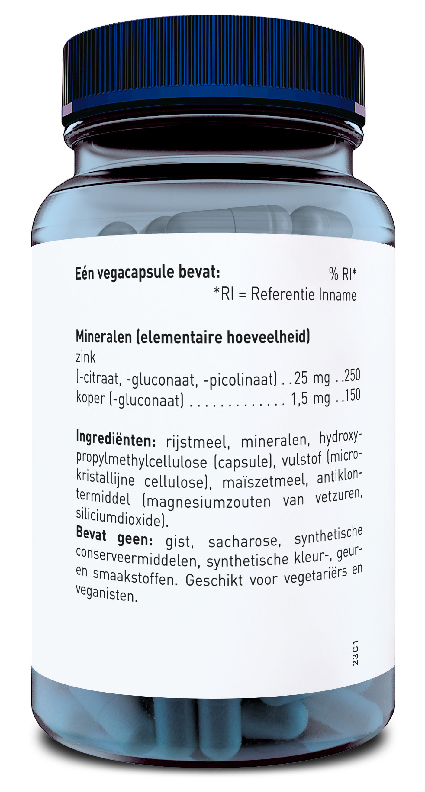 | Zink (-citraat, - gluconaat, -picolinaat) | 25 mg | 250% |