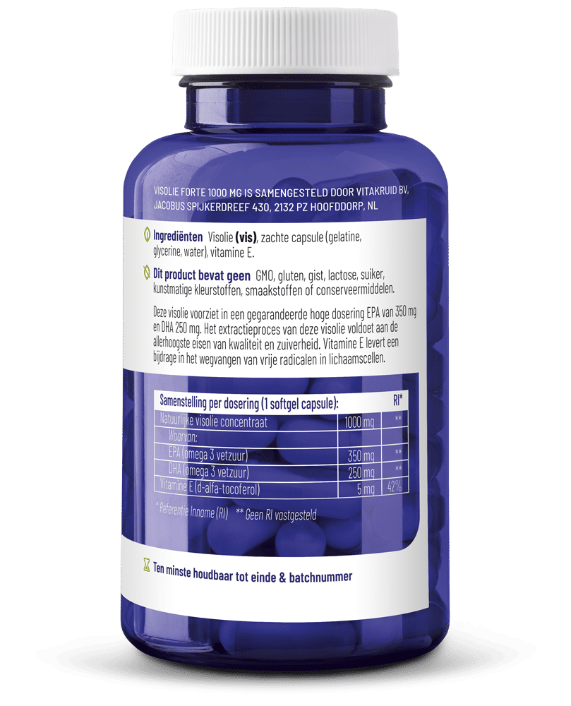 Onze voeding laat vaak een tekort aan Omega-3 vetzuren zien. De laatste 20 jaar is in onze voeding veel aandacht besteed aan de Omega-6 vetzuren (plantaardige oliën en margarines). Verhoudingsgewijs wordt er onvoldoende Omega-3 vetzuren geconsumeerd ten opzichte van Omega-6 vetzuren waardoor de eicosanoïden (EPA) balans wordt verstoord. Onder invloed van de goede visolie blijkt het vetspectrum te wijzigen. Het regelmatig gebruiken van Omega-3 vetzuren, net als andere macronutriënten is voor aanstaande moeders van belang. Visolie forte van Vitakruid bevat 1000 mg visolieconcentraat per capsule en voorziet in een EPA van 350 mg en DHA van 250 mg. Deze uitzonderlijke kwaliteit voldoet aan de allerhoogste eisen van stabiliteit en zuiverheid.