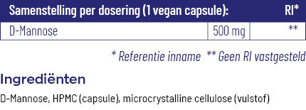 D-Mannose, HPMC (capsule), microcrystalline cellulose (vulstof), magnesium stearaat (anti-klontermiddel), silicium dioxide (anti-klontermiddel).