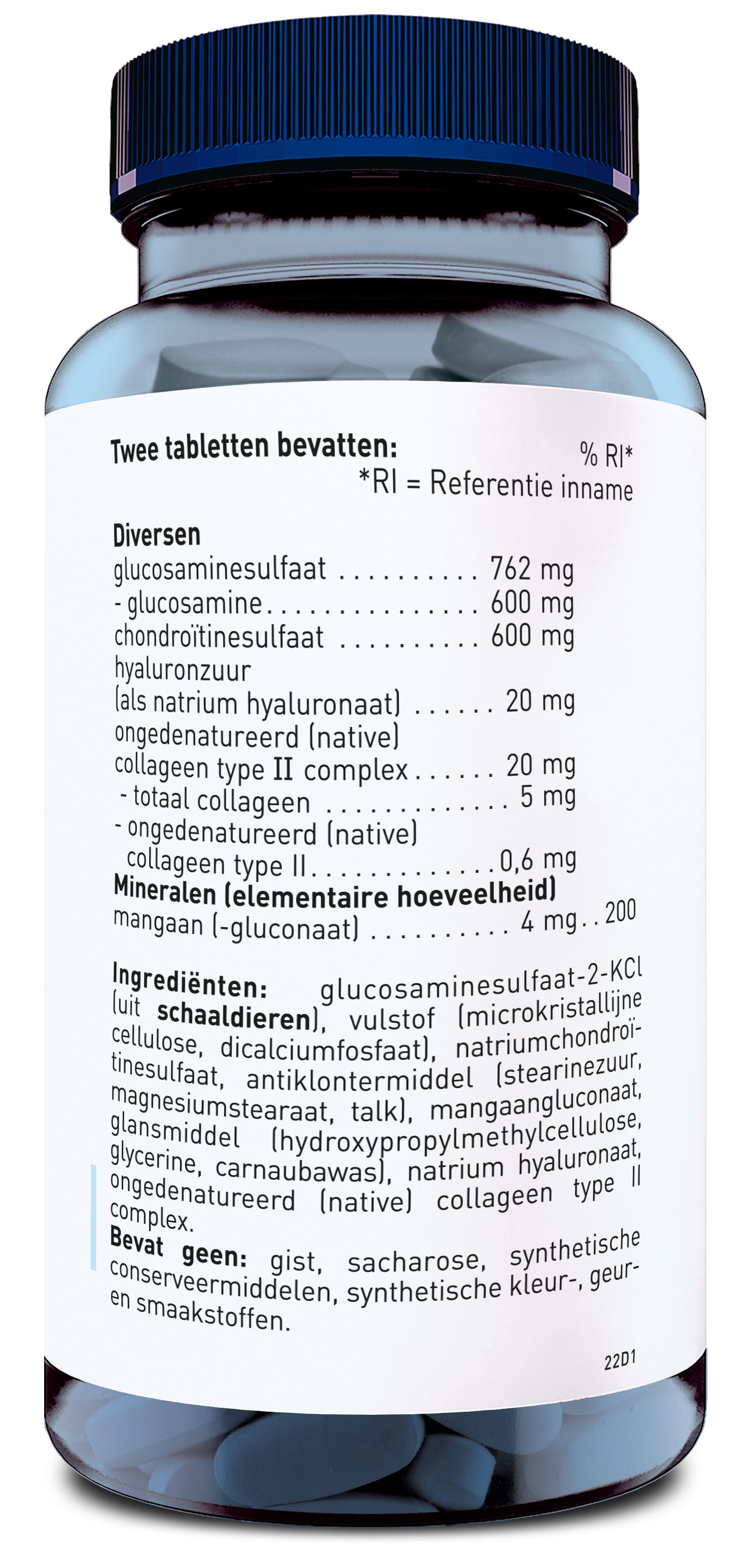 Glucosaminesulfaat-2-KCl (uit SCHAALDIEREN), vulstof (microkristallijne cellulose, dicalciumfosfaat), natriumchondroïtinesulfaat, antiklontermiddel (stearinezuur, magnesiumstearaat, talk), mangaangluconaat, glansmiddel (hydroxypropylmethylcellulose, glycerine, carnaubawas), natrium hyaluronaat, ongedenatureerd (native) collageen type II complex.
