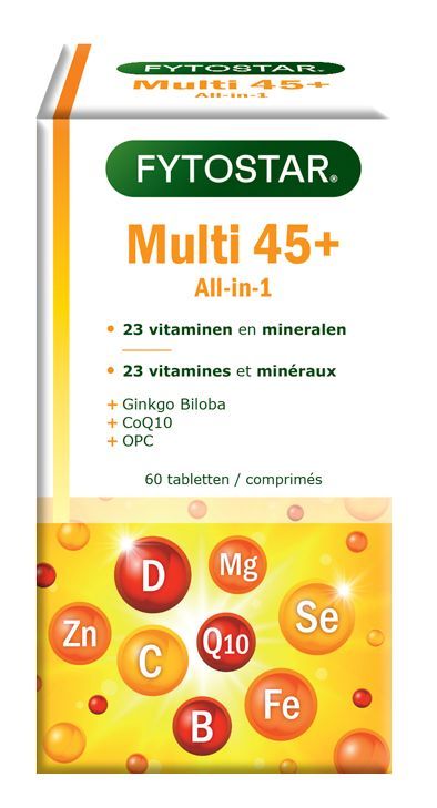 Fytostar Multi 45+ is een multivitaminen- en mineralencomplex op maat van 45 plussers die streven naar een fit, actief leven en een jeugdig gevoel. De all-in-one formule van Multi 45+ bevat 23 vitaminen en mineralen en bovendien 3 specifieke toevoegingen voor iedereen van deze leeftijdsklasse.