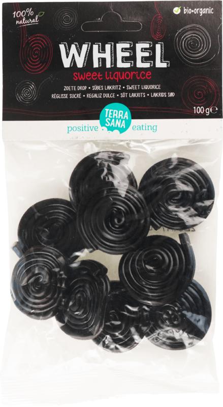 De Wheel dropveter is een begrip. Stevig van structuur, licht zoet van smaak. Deze biologische variant is gezoet met blackstrapmelasse en zoethoutwortelextract uit Italië.