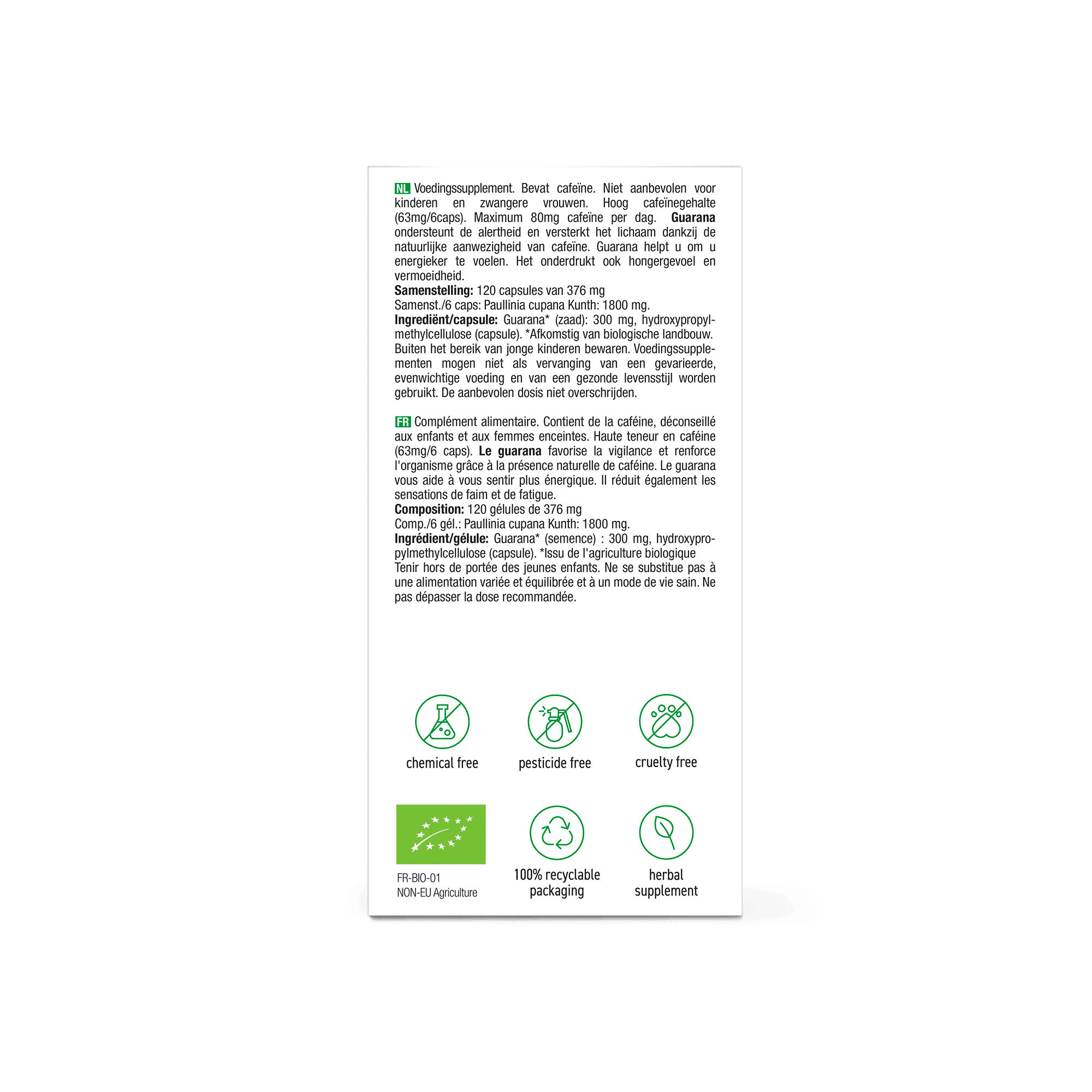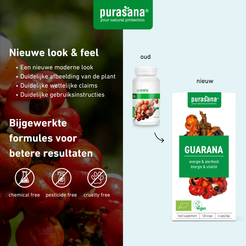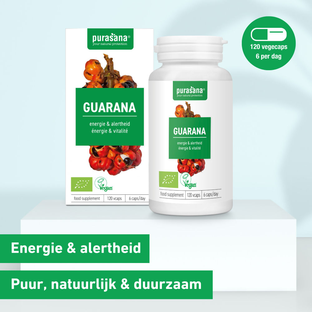 Guarana heeft een hoog cafeïnegehalte (63 mg/6 caps). Nuttig maximum 80 mg cafeïne per dag.