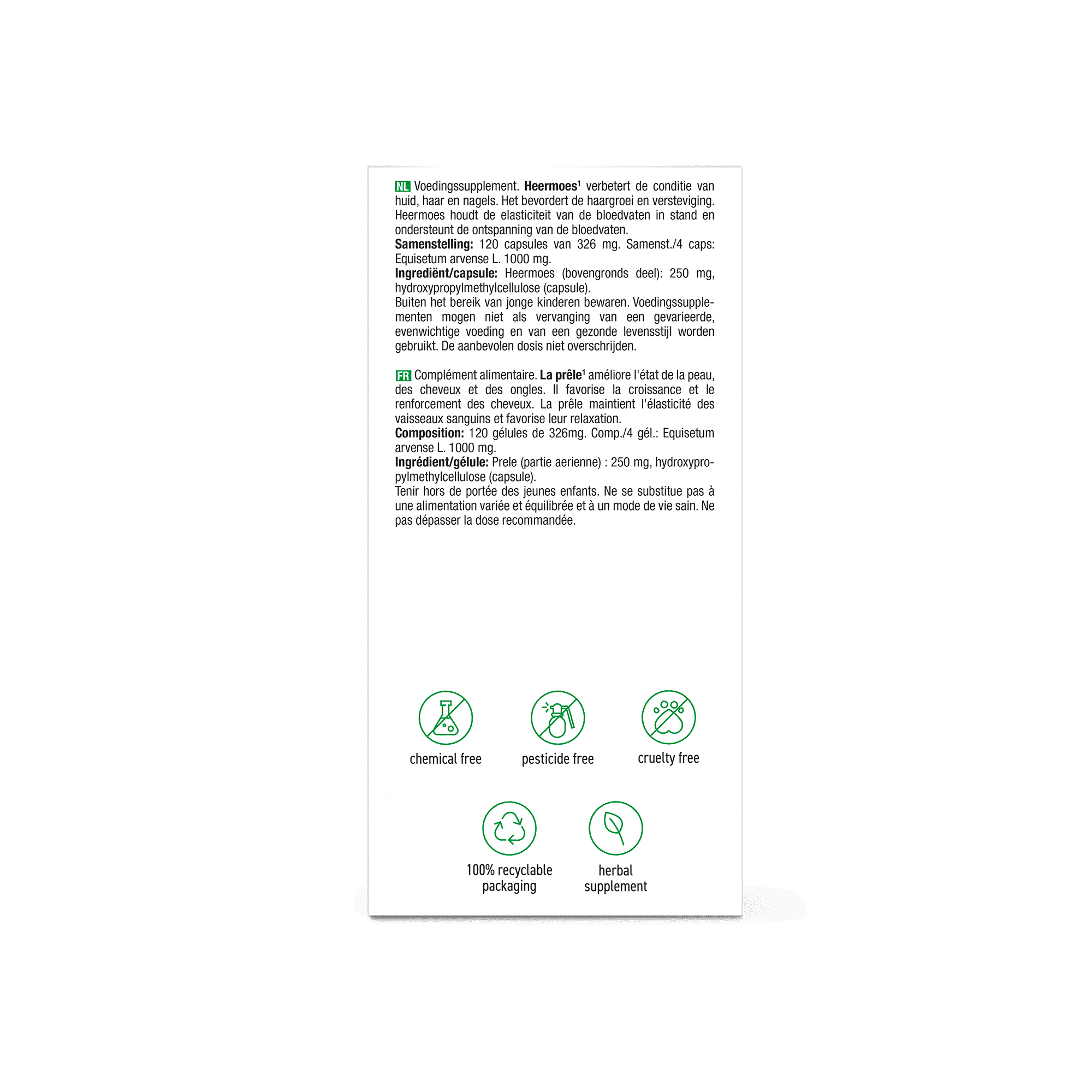 Heermoes* (bovengronds deel), Capsule: plantaardig geleermiddel (hydroxypropylmethylcellulose).