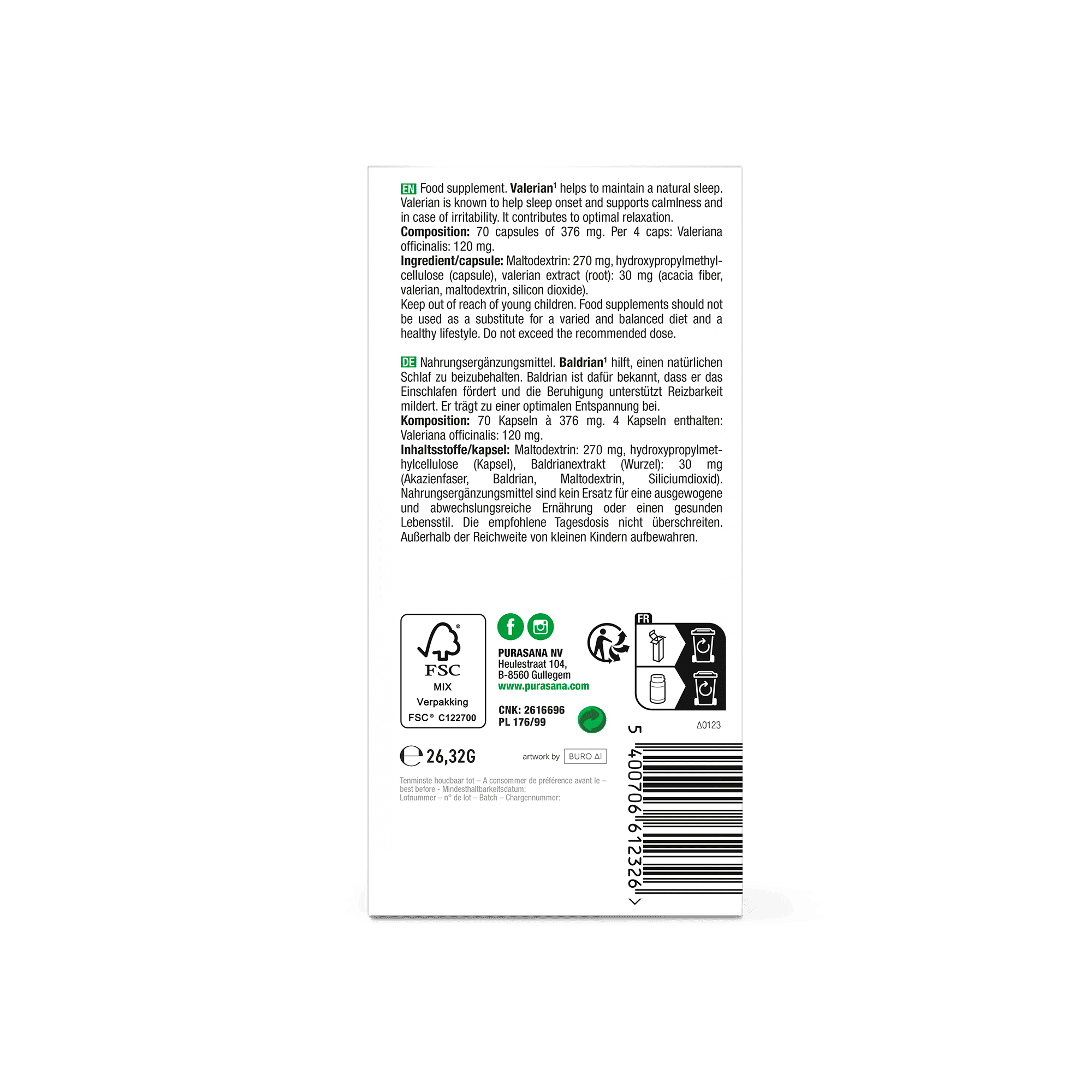 Valeriaanextract (wortel), maltodextrine, Capsule: plantaardig geleermiddel (hydroxypropylmethylcellulose).