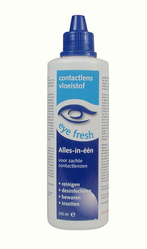 Was uw handen, spoel ze goed af en maak ze droog met een schone handdoek. Neem de lens van uw oog en leg deze in uw handpalm. Giet nu 5-10 druppels Eye Fresh op de lens en wrijf met uw wijsvinger de lens voorzichtig schoon. Spoel de lens grondig af met Eye Fresh vloeistof. Plaats de lens vervolgens in de met verse Eye Fresh gevulde lenshouder. Voor een optimale desinfectie dienen de lenzen minimaal 4 uur in de gesloten lenshouder bewaard te worden. Na desinfectie kunt u de lenzen direct inzetten.