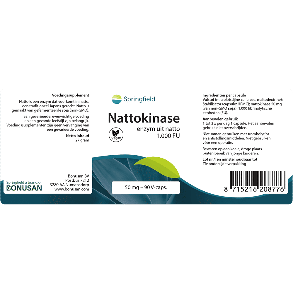 Vulstof (microkristalijne cellulose, maltodextrine); Stabilisator (capsule: HPMC); nattokinase 50 mg (van SOJA (non-GMO).