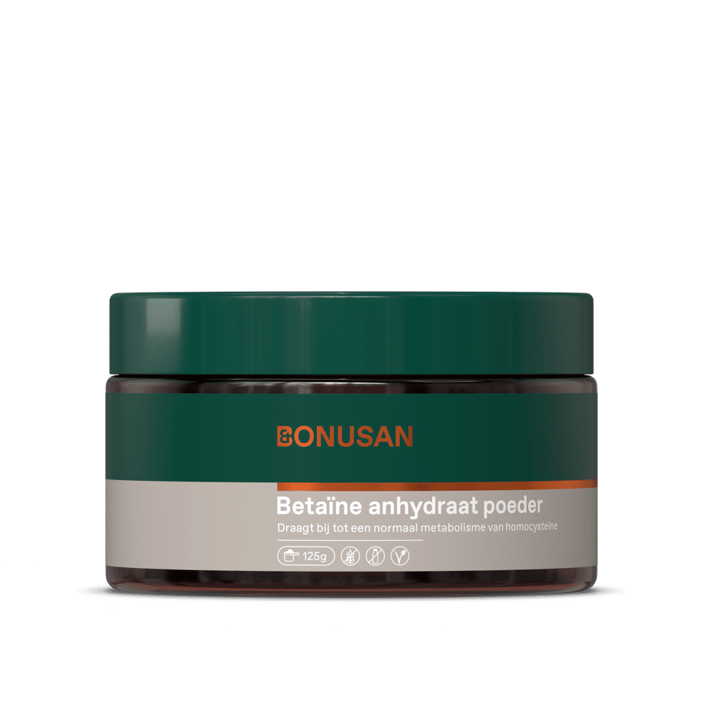 Bonusan betaïne anhydraat poeder is vrij van hulpstoffen en bevat dus 100% betaïne anhydraat. Dit is de ontzuurde vorm van betaïne en daardoor vriendelijk voor de maag en de tanden. Recente verbetering in de samenstelling maakt dat Bonusan betaïne anhydraat poeder fijner van structuur is en nóg beter oplost in water en vruchtensappen.