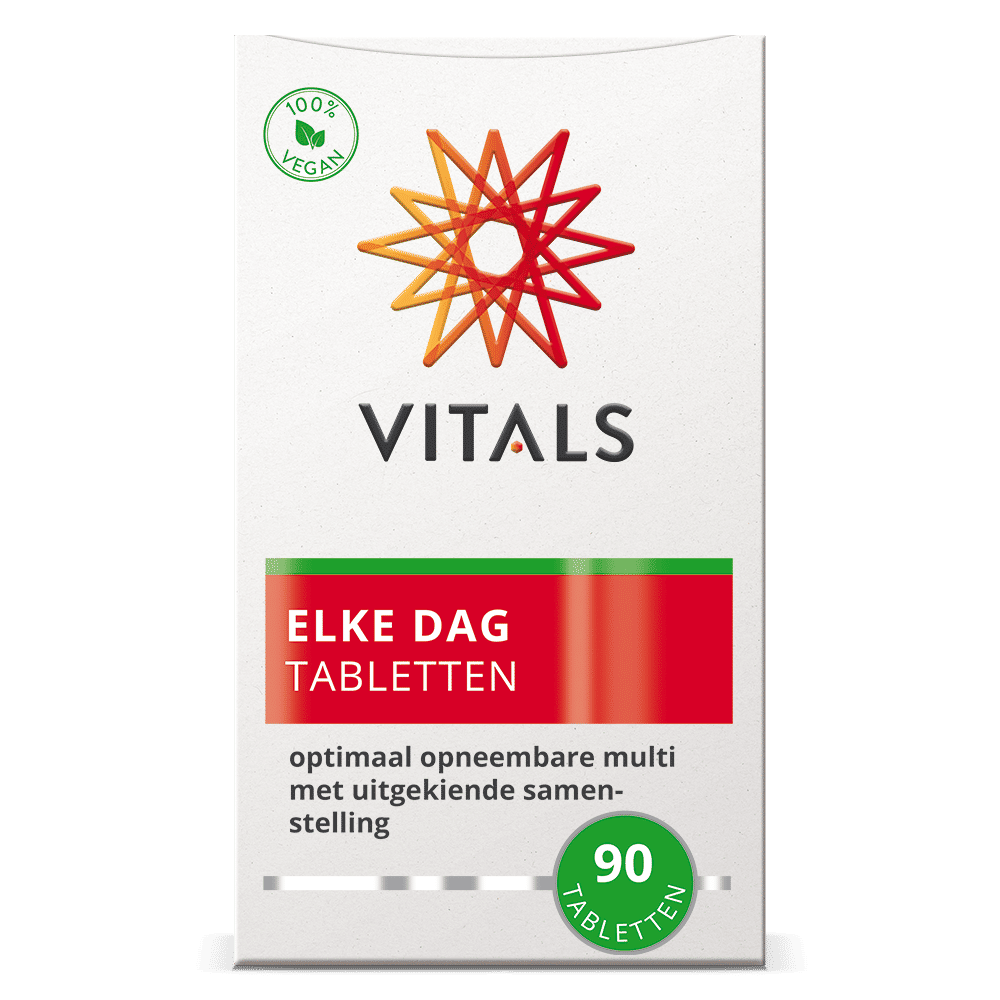 Elke Dag is specifiek ontworpen voor volwassenen. Vitals heeft aparte multi’s ontwikkeld voor kinderen, ouderen en voor vrouwen die zwanger zijn of willen worden. Zie ook Elke Dag Junior, Elke Dag 50+ en Elke Dag Mama. Jongeren en (jong)volwassenen kunnen kiezen voor Elke Dag Basis (1 per dag) of Elke Dag Capsules (jongeren 1 capsule per dag en volwassenen 2 capsules per dag). Daarnaast is er Elke Dag Poeder voor diegenen die liever geen capsule of tablet slikken, of de multi liever ergens doorheen mengen. Volwassenen en ouderen die het beste van het beste willen, kiezen voor Elke Dag Platinum (twee tabletten per dag).