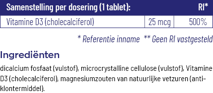 Dicalciumfosfaat (vulstof), cellulose mc (vulstof), magnesium stearaat (anti-klontermiddel), Vitamine D3 (cholecalceferol).