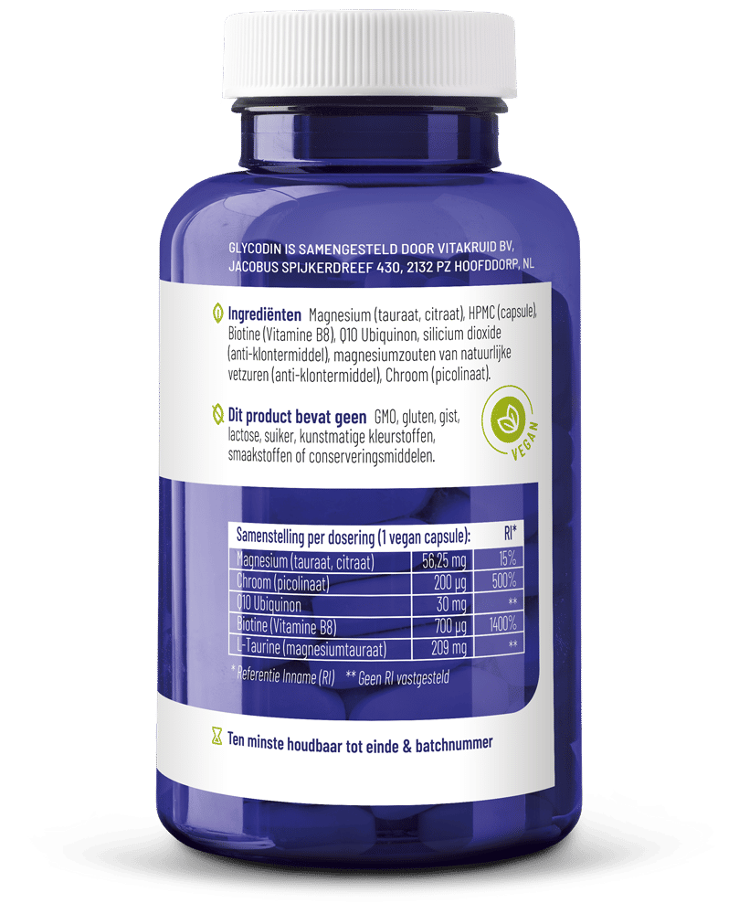Glucose, of bloedsuiker, is de natuurlijke benzine van ons lichaam. We verkrijgen de brandstof door de afbraak van koolhydraten uit voeding, waarna ons lichaam de verworven energie naar de behoevende plaats vervoert. Het niveau van glucose in ons bloed noemen we de bloedsuikerspiegel. Gedurende de dag probeert ons systeem continu een stabiele bloedsuikerspiegel te behouden. Een verstoorde glucosebalans heeft namelijk talloze negatieve gezondheidseffecten. De complexformule Glycodin voorziet per capsule in een royale hoeveelheid van 200 mcg chroom picolinaat, 250 mcg biologisch actief magnesiumtauraat, 700 mcg van de energieleverancier biotine (b8) en 75 mcg van het endogene vetzuur alfa-liponzuur.