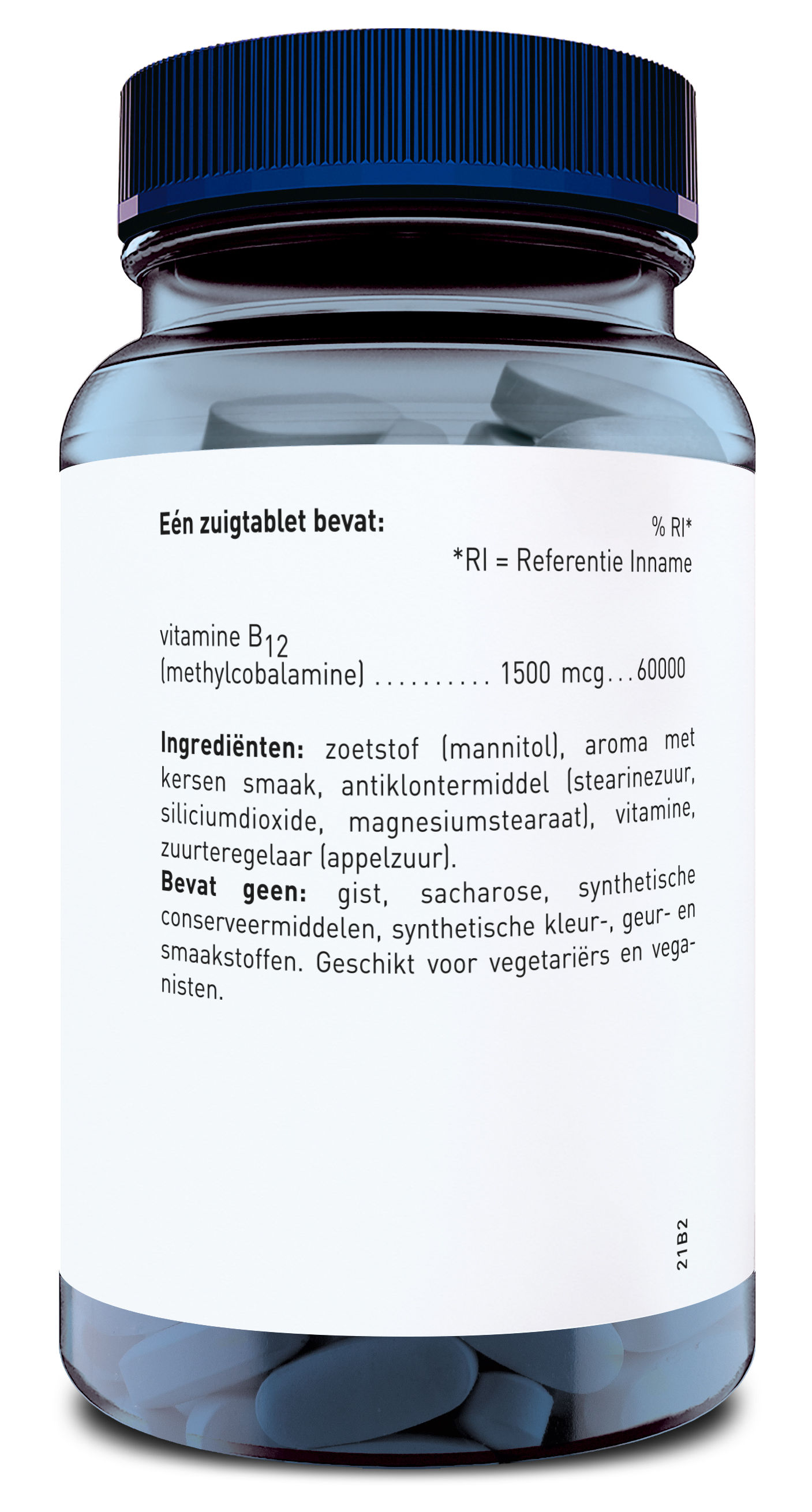 Bij flexitariërs, vegetariërs of veganisten kan vitamine B12 verminderd in de voeding aanwezig zijn. Ook ouder worden, roken en langdurig medicijngebruik kunnen zorgen voor een verhoogde behoefte aan vitamine B12. Co-Enzym B12 bevat een krachtige dosering vitamine B12 als methylcobalamine. Dit is de actieve vorm van vitamine B12, zoals de natuurlijke vorm van B12 ook voorkomt in je lichaam. Voor opname hoeft deze vorm niet eerst omgezet te worden, en dat maakt methylcobalamine goed opneembaar. De zuigtablet kun je gemakkelijk, zonder water innemen. De zoete smaak komt van de natuurlijke zoetstof mannitol. Co-Enzym B12 zuigtablet is gegarandeerd vrij van dierlijke ingrediënten.