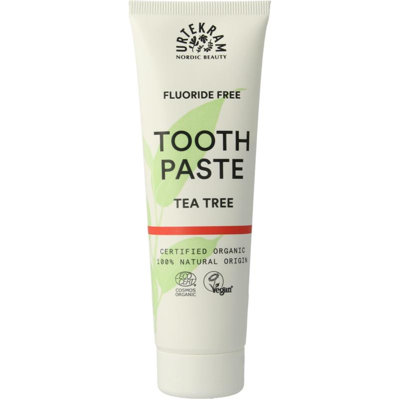 Urtekram tandpasta met een extra dosis desinfecterende tea tree. Verder is deze tandpasta een pure natuurlijke krachtpatser. Het gebuikte krijt is miljoenen jaren geleden ontstaan en wordt gewonnen op de zeebodem om vervolgens voor verdere verwerking te worden verpulverd. Dat is ook de reden waarom deze tandpasta de kenmerkende lichtgrijze kleur van natuurlijk kalk heeft. Verder bevat deze tandpasta een flinke dosis aloë vera, wat het tandvlees helpt beschermen en verzorgt. En als extraatje is er een beetje mirre toegevoegd, dat bekend staat om zijn desinfecterende werking.