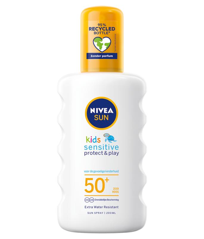 Nivea sun kids protect & sensitive zonnespray SPF 50 is speciaal ontwikkeld voor de tere, gevoelige kinderhuid en biedt direct effectieve UVA/UVB bescherming tegen verbranding door de zon en lange termijn huidschade. De verzorgende, geurloze formule vermindert het risico op huidirraties door de zon en is extra water resistent.
