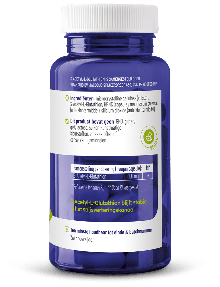 Microcrystalline cellulose (vulstof), S-Acetyl-L-Glutathion, HPMC (capsule), magnesium stearaat (anti-klontermiddel), silicium dioxide (anti-klontermiddel).
