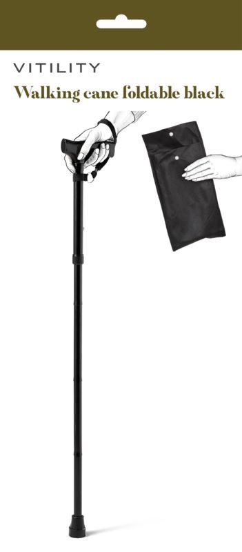 De wandelstok kan in hoogte worden versteld en gemakkelijk ingeklapt worden. De wandelstok heeft een houten handvat en wordt geleverd met een opbergtasje en polsbandje.