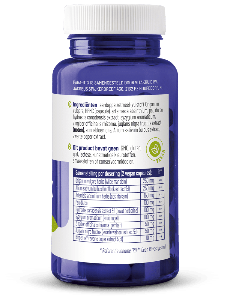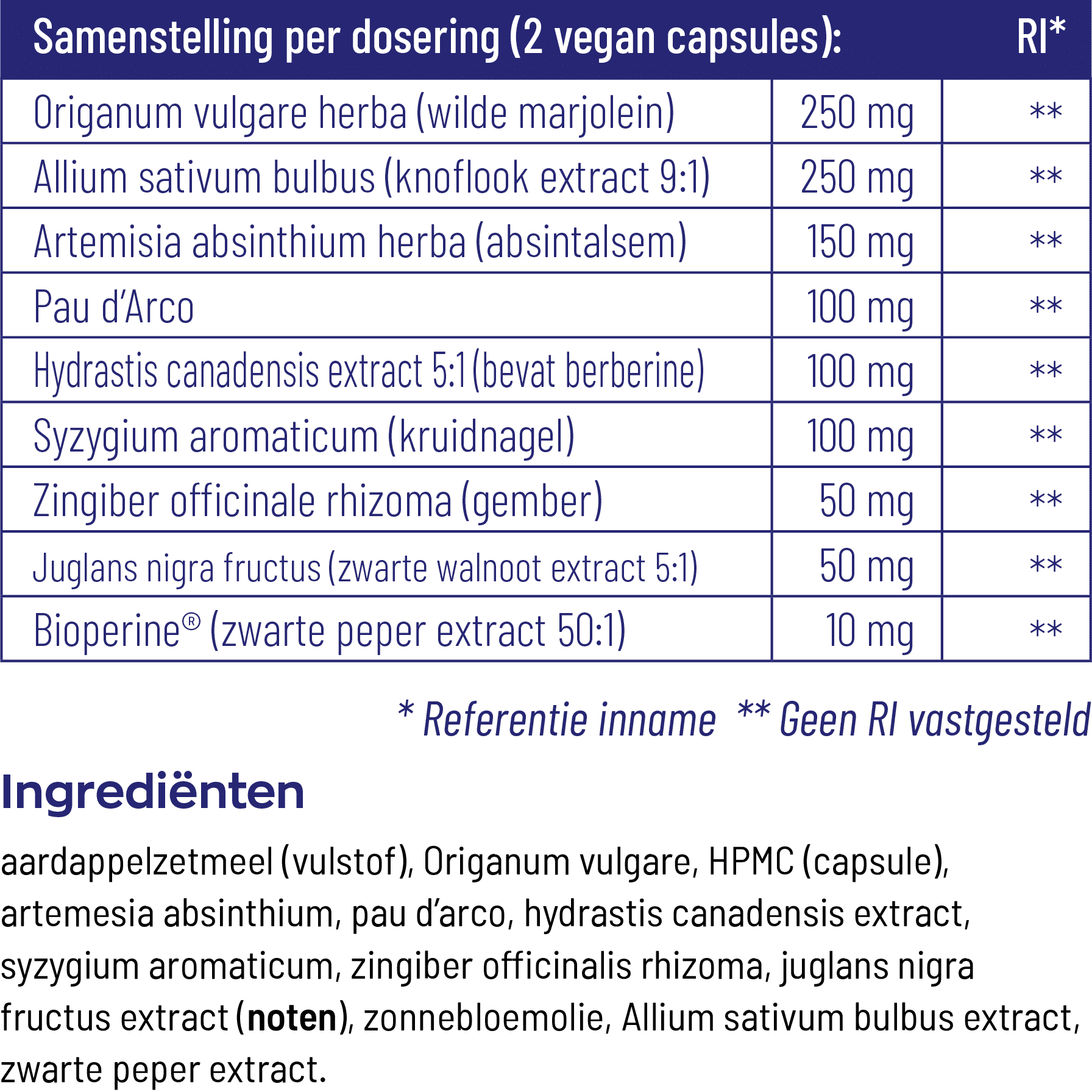 Origanum vulgare, Allium sativum bulbus, Vegetarische HPMC capsule, artemesia absinthium, aardappelzetmeel (vulstof), pau d’arco, hydrastis canadensis extract, syzygium aromaticum, zingiber officinalis rhizoma, juglans nigra fructus extract, zonnebloemolie (flow verbeteraar), zwarte peper extract.