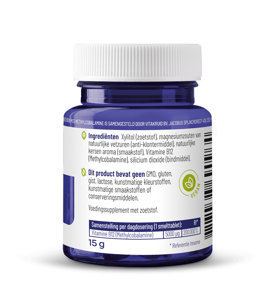 Inname van vitamine B12 via het mondslijmvlies (onder de tong) zorgt voor een optimale opname van vitamine B12. De vorm B12 Methylcobalamine is een actieve vorm van B12 en goed opneembaar.