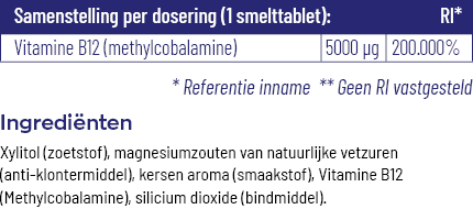 Xylitol (zoetstof), magnesium stearaat (antiklontermiddel), kersen aroma (smaakstof), Vitamine B12 (Methylcobalamine), silicium dioxide (bindmiddel).
