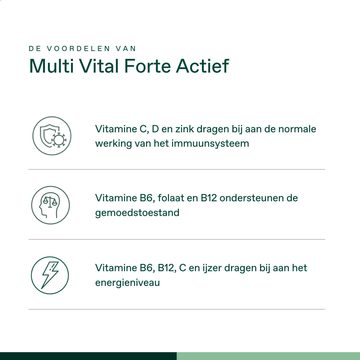 De Multi Vital Forte Actief is een multivitamine met belangrijke vitaminen en mineralen voor dagelijks gebruik. Door de toevoeging van organisch gebonden mineralen en actief vitamine C, B6, B12 en foliumzuur (folaat), hebben de vitamines en mineralen een goede biologische beschikbaarheid.