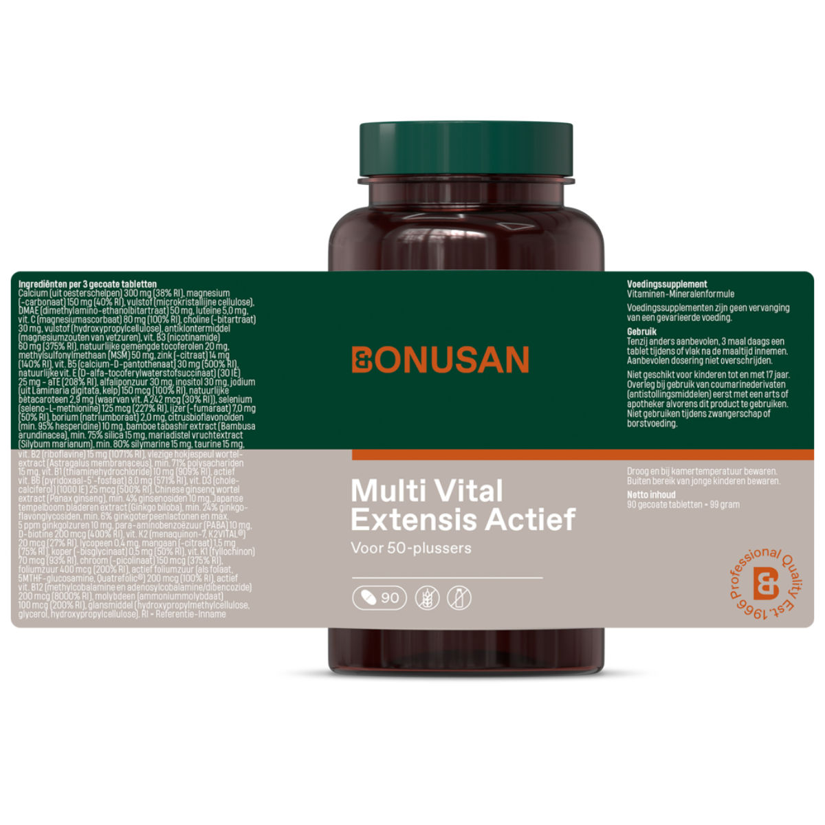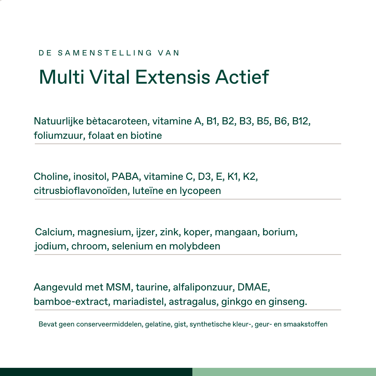Mineralen: Calcium (uit OESTERSCHELPEN)(weekdier), Magnesium (als magnesiumcarbonaat), IJzer (als ijzerbisglycinaat), Zink (als zinkcitraat), Mangaan (als mangaancitraat), Borium (als natriumboraat), Koper (als koperbisglycinaat), Jodium (uit kelp), Chroom (als chroompicolinaat), Selenium (als seleno-L-methionine), Molybdeen (als ammoniummolybdaat), vulstof (microkristallijne cellulose (cellulosegel), cellulose (HPC)), Vitaminen: Natuurlijk bètacaroteen, Vitamine B1 (als thiamine HCl), Vitamine B2 (als riboflavine), Vitamine B3 (als nicotinamide), Vitamine B5 (als calciumpantothenaat), Actief vitamine B6 (als pyridoxaal-5-fosfaat), Actief vitamine B12 (als methylcobalamine en adenosylcobalamine/dibencozide), Actief folaat (als glucosaminezout van 5-methyl-tetrahydrofolaat), Foliumzuur, D-Biotine, Vitamine C (als magnesiumascorbaat), Vitamine D3 (1000 IE) (als cholecalciferol), Vitamine K1 (als fytomenadion), Vitamine K2 (als menaquinon-7), DMAE, cholinebitartraat, luteine, antiklontermiddel(mangnesiumstearaat), natuurlijke gemengde tocoferolen, alfa liponzuur, tuarine, inositol, natuurlijk bètacaroteen, citrusbioflavonoïden, bamboe-extract, mariadistel (Silybum marianum), taurine, vlezige hokjespeul (Astragalus membranaceus), Chinese/Koreaanse ginseng (Panax ginseng), D-biotine, Japanse tempelboom (Ginkgo biloba), PABA, lycopeen, glansmiddel (HPMC, MCT-olie).