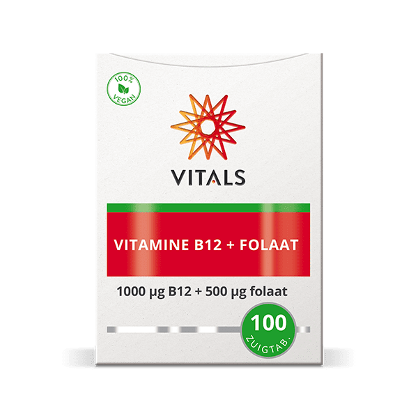 Vitamine B12 werkt nauw samen met folaat in het lichaam. Derhalve is het in de meeste gevallen van belang deze nutriënten gecombineerd in te nemen. Dit product bestaat uit 1000 mcg vitamine B12 in de biologisch actieve vormen methylcobalamine en adenosylcobalamine (ook wel dibencozide genoemd) en 500 mcg 5-methyltetrahydrofolaat (5-MTHF). Dit zijn de vormen zoals vitamine B12 en folaat door het lichaam gebruikt worden. In andere producten komt vitamine B12 vaak voor als cyanocobalamine en folaat als foliumzuur (pteroylmonoglutaminezuur). Dit zijn synthetische vormen die zo niet in de natuur voorkomen en door het lichaam omgezet moeten worden in de biologisch actieve vormen. Een probleem met pteroylmonoglutaminezuur is dat bij een relatief grote groep mensen de omzetting in 5-MTHF moeizaam verloopt. Daarom maakt Vitals gebruik van Quatrefolic®, dat bestaat uit 5-methyltetrahydrofolaat gebonden aan glucosaminezout omwille van de stabiliteit en superieure biologische beschikbaarheid.