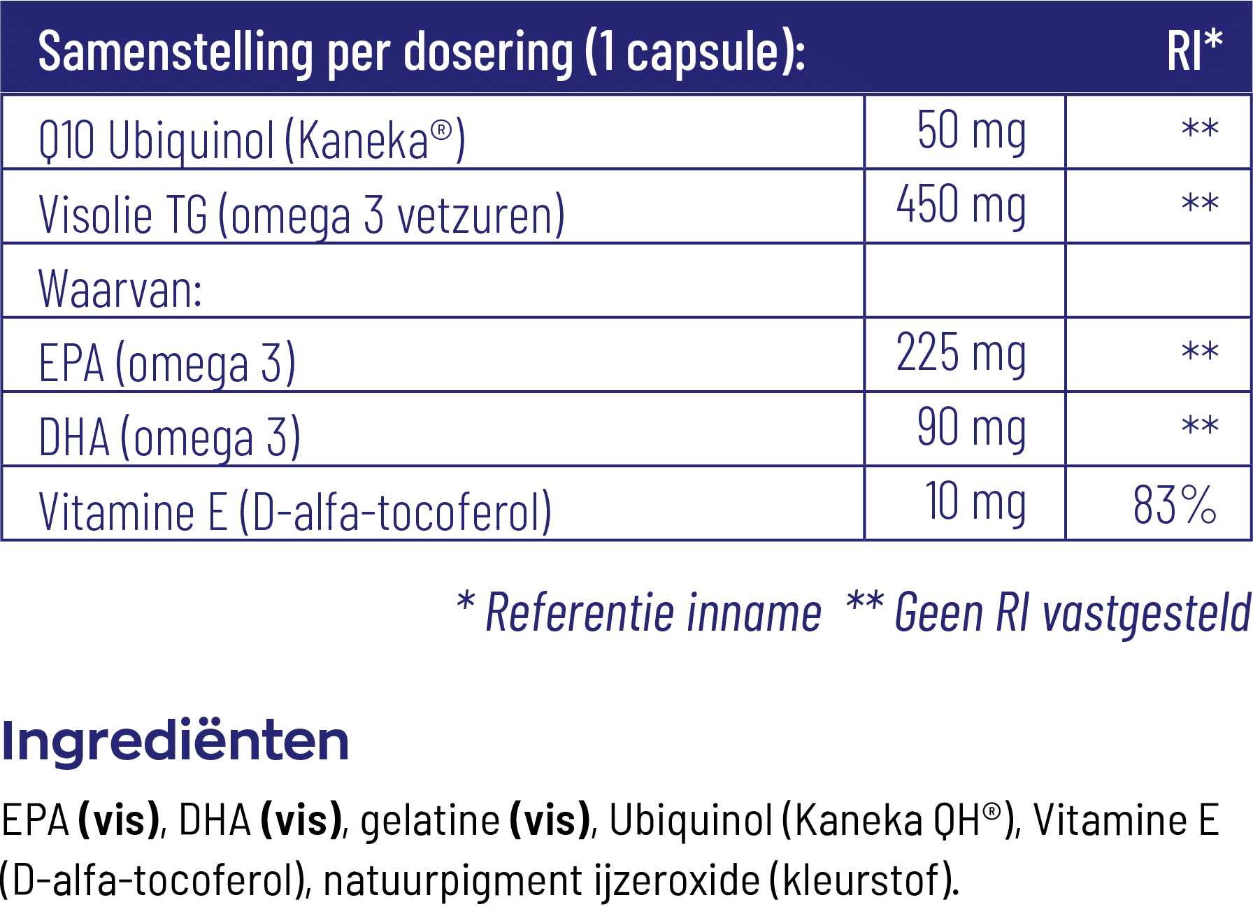 EPA (VIS), DHA (VIS), gelatine (VIS), Ubiquinol (Kaneka QH®), Vitamine E (D-alfa-tocoferol), natuurpigment ijzeroxide (kleurstof).