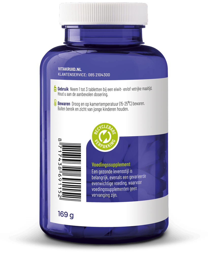 Neem 1 tot 3 tabletten bij een eiwit- en/of vetrijke maaltijd.