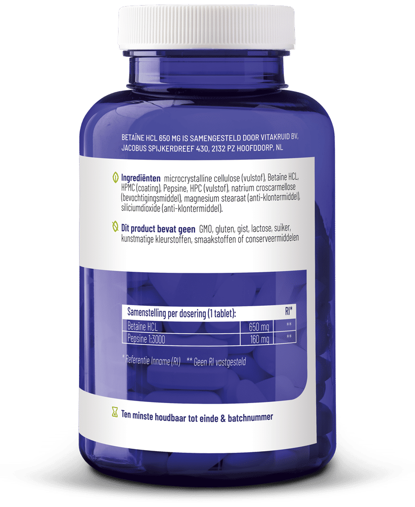 Microcrystalline cellulose (vulstof), Betaïne HCL, HPMC (coating), Pepsine, HPC (vulstof), natrium croscarmellose (bevochtigingsmiddel), magnesium stearaat (anti-klontermiddel), siliciumdioxide (anti-klontermiddel).