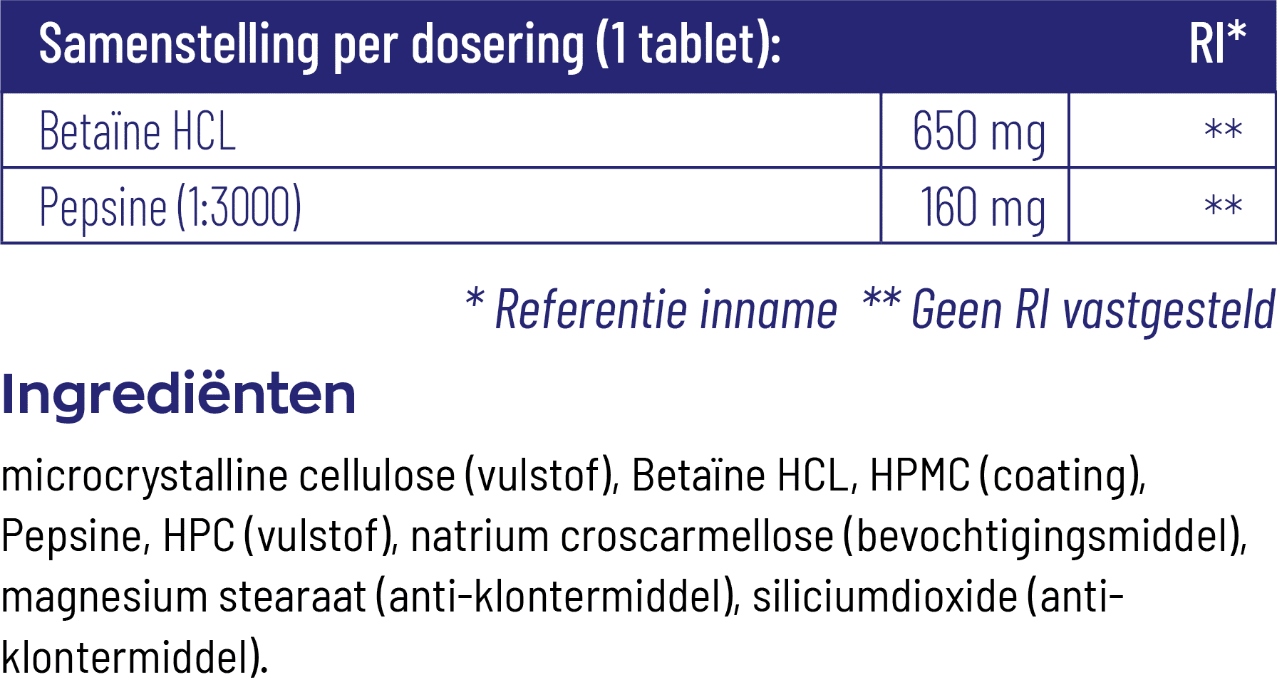 Microcrystalline cellulose (vulstof), Betaïne HCL, HPMC (coating), Pepsine, HPC (vulstof), natrium croscarmellose (bevochtigingsmiddel), magnesium stearaat (anti-klontermiddel), siliciumdioxide (anti-klontermiddel).