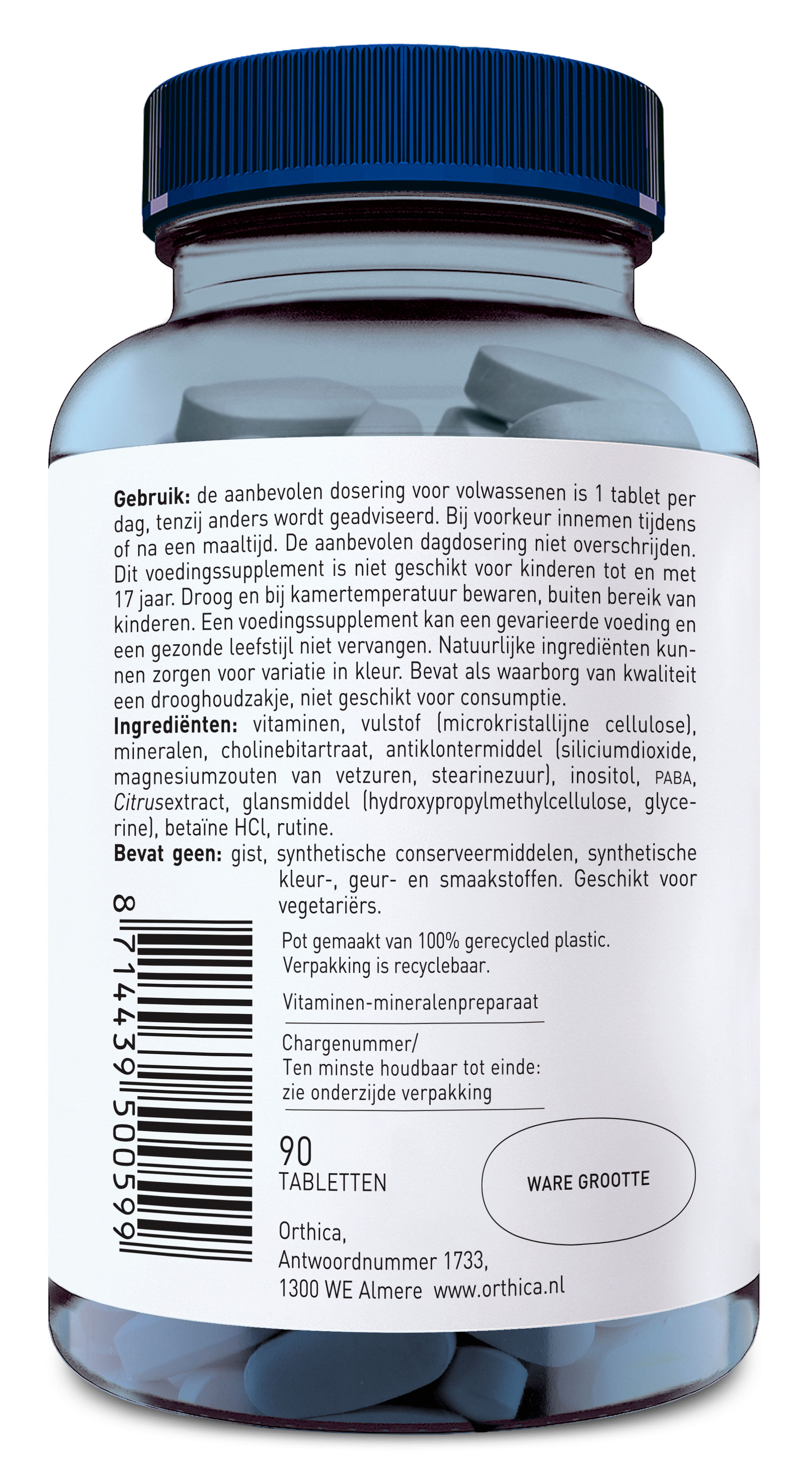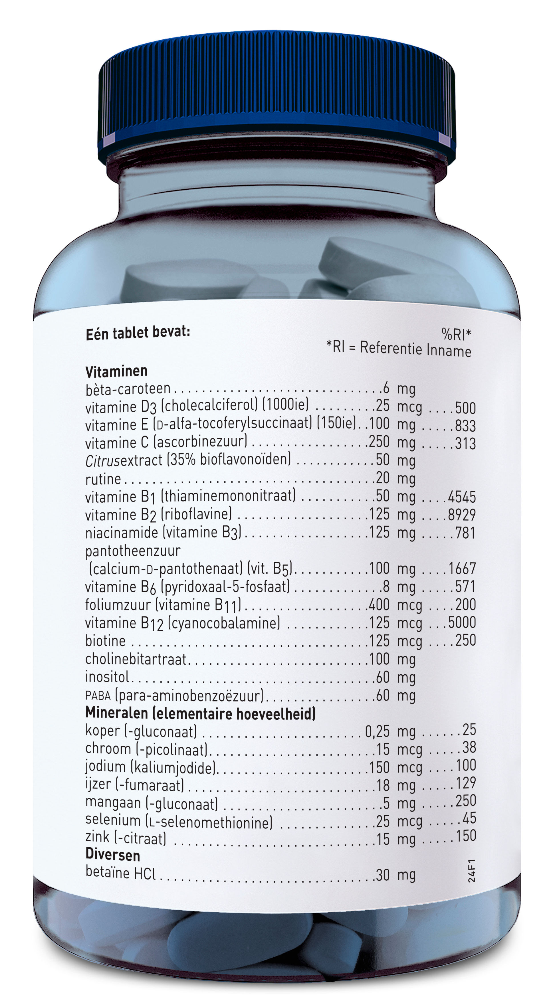 vitaminen, vulstof (microkristallijne cellulose), mineralen, cholinebitartraat, antiklontermiddel (siliciumdioxide, magnesiumstearaat, stearinezuur), inositol, PABA, Citrusextract, glansmiddel (hydroxypropylmethylcellulose, glycerine), betaïne HCl, rutine.