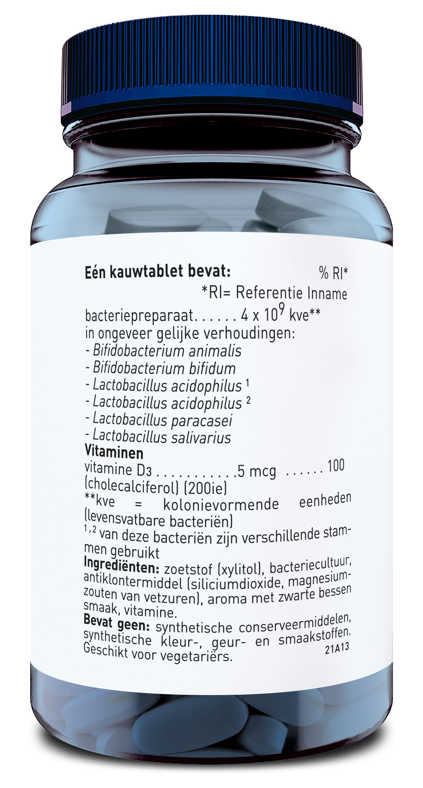 Zoetstof (xylitol), bacteriecultuur, antiklontermiddel (siliciumdioxide, magnesiumzouten van vetzuren), aroma met zwarte bessen smaak, vitamine.