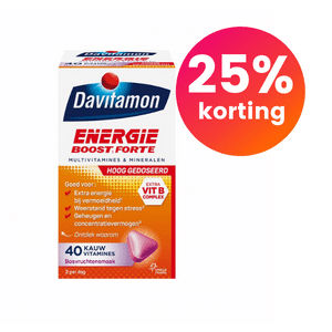 Davitamon Energie Boost bevat een combinatie van verschillende essentiële vitamines en mineralen gericht op extra energie. Maar het assortiment van Davitamon bevat nog veel meer supplementen die speciaal zijn samengesteld voor de verbetering of instandhouding van bepaalde lichaamsfuncties of voor specifieke doelgroepen zoals Davitamon Compleet Zwanger voor ondersteuning van het lichaam tijdens en na de zwangerschap, Davitamon Junior voor kinderen in de leeftijd 3-12 en Davitamon Compleet Weerstand voor een goede weerstand. Bekijk alle Davitamon aanbiedingen